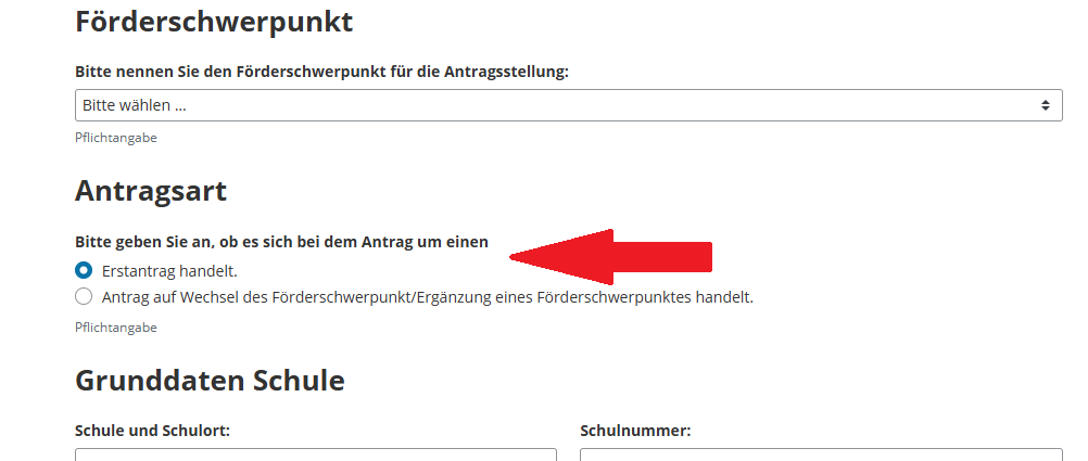 - Im Portal (Beteiligung NRW) zur Antragsstellung können Sie wählen, ob es sich um einen Neuantrag oder den Wechsel/Hinzunahme eines Förderschwerpunktes handelt.